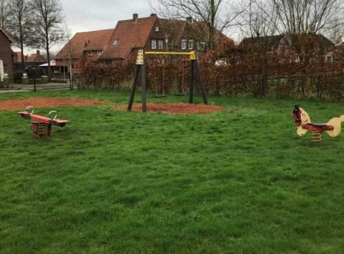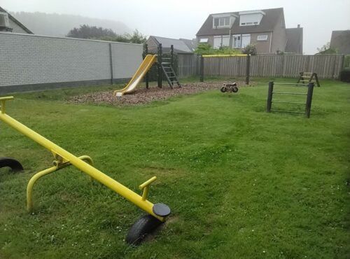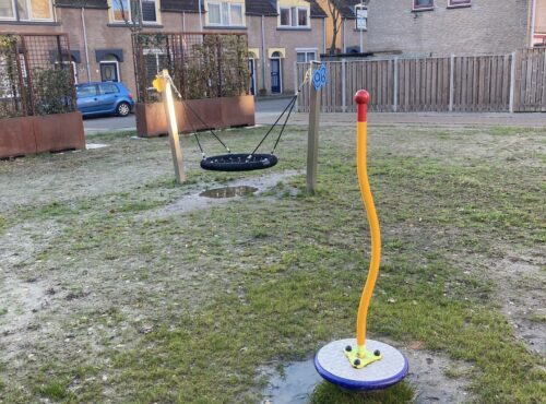 Kleine speelvoorziening met mandschommel en twister.lees verder